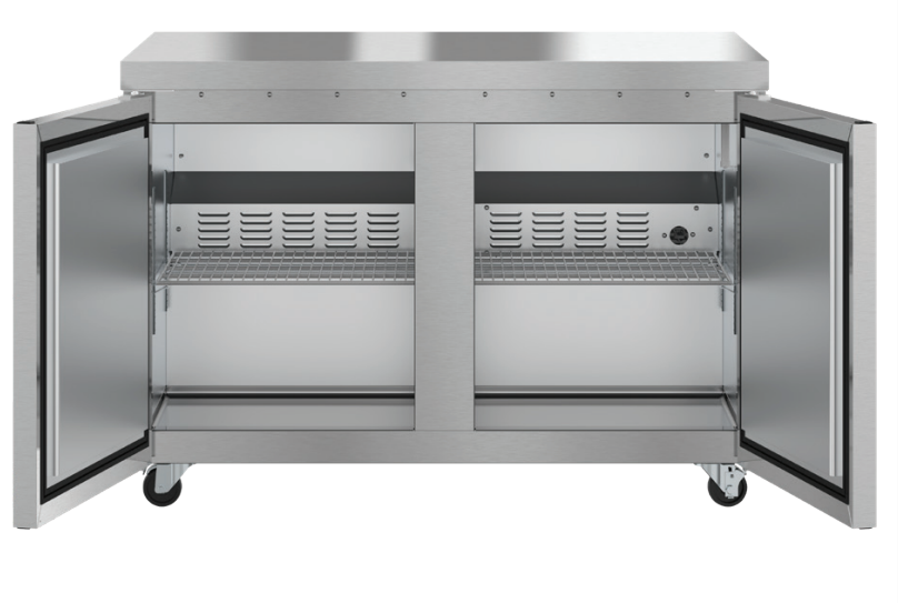 Built to maintain NSF-7 certified temperatures in ambient conditions up to 100°F, the VUR48A ensures safe, consistent cooling even in demanding environments. Its front-breathing air flow system allows installation against walls or other appliances without sacrificing performance. Inside, two epoxy-coated adjustable shelves hold up to 105 lbs each, and the self-closing doors include stay-open features for convenient restocking.