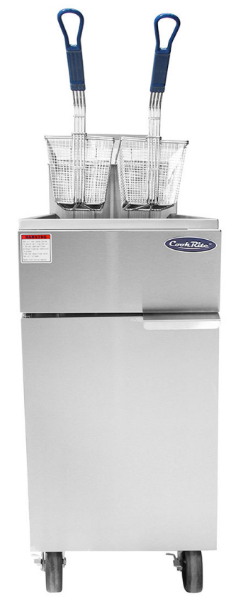CookRite Fryer, LP gas, floor model, 15-3/5″W x 30-1/10″D x 44-2/5″H, 40 lb. capacity, (3) burners, milivolt control, 200°F- 400°F temperature range, (2) nickel plated baskets with coated handles, basket hanger, oil cooling zone seated in the bottom of the tank, stainless steel structure, (4) casters, cETLus, ETL-Sanitation