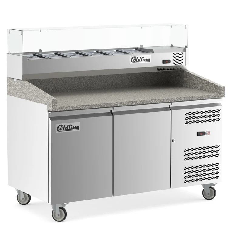 Coldline Refrigerated Pizza Prep, with marble top, 60″W, 15.1 cu.ft., (2) swinging solid doors, 33-41°F temperature range, electronic control system, automatic defrost, stainless steel interior & exterior, R290, 2.4 amps, 1/4 HP, 115v/60/1-ph, NEMA 5-15P, cETLus, ETL-Sanitation