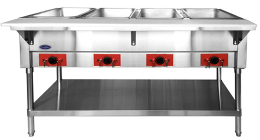 CookRite Steam Table, electric, dry or wet heat, 58″W x 29-1/2″D x 33-1/2″H, (4) open pan wells (water pans included), individual infinite temperate controls, insulated compartments, cutting board shelf, undershelf, stainless steel construction, 500 watts per well, 120v/60/1-ph, cord with NEMA 5-20P, cETLus, ETL-Sanitation