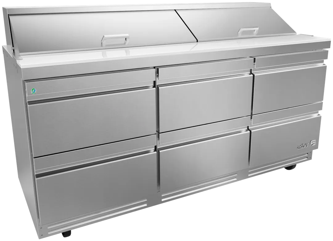 Premium Salad & Sandwich Prep Table, 72-1/2″W x 30-1/8″D x 44-5/8″H, (6) stainless steel drawers, 25.4 cu. ft. capacity, 18 pans, 115V/60Hz, 1/4 HP, 2.5A, R290 hydrocarbon refrigerant, electronic controller, temperature range 32°F to 41°F, ambient up to 100°F/65% RH, Ecomateâ„¢ insulation, exclusive high-capacity base design, full stainless-steel exterior & interior, insulated lid, unique bottom air panel, fixed top/drawer pan dividers, high-strength slides, full-length recessed handles, magnetic one-piece door gaskets, 5″ casters (front with brakes), NSF-7, ETL, DOE compliant, Made in North America.